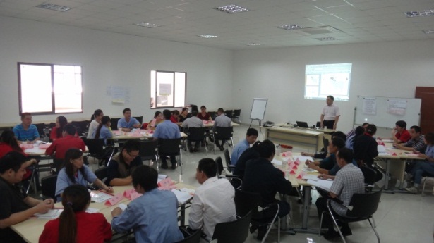 受培训人员在前期填写了培训需求表,通过调查表的结果被分成6组,每小组6位成员,围成一小桌,小组成员通过讨论为自己确定一个组名和一句口号,在响亮地喊出自己的口号之后,培训正式开始了。