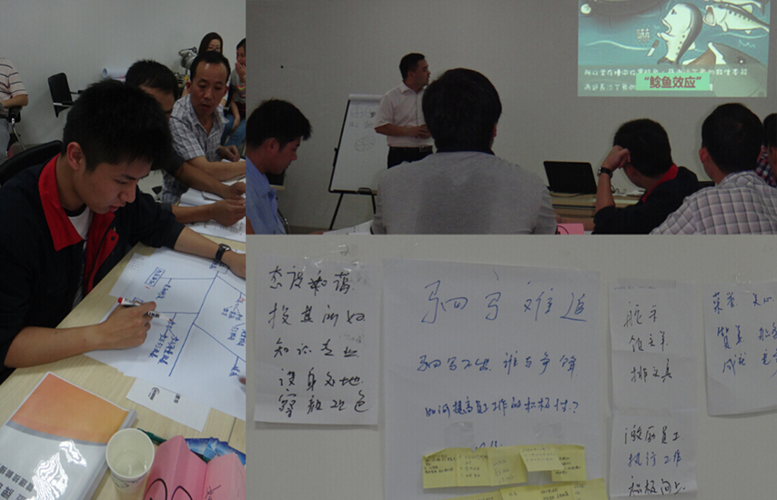 在培训中,祝勇老师分章节详细地讲述了管理与领导、沟通理念和方式、激励方法与技巧、思维方式等理论。讲述图文并茂,案例丰富,在场的人员都听得津津有味,并仔细记录下对自己有帮助的理论与知识。培训采用竞赛的方式,通过穿插在培训中的小游戏及互动环节,由老师观察个小组成员的表现并给予相应的积分奖励,累计积分多的小组将获得后的胜利。每组成员通过激烈的讨论将自己的成果分享在教室四周的墙上。