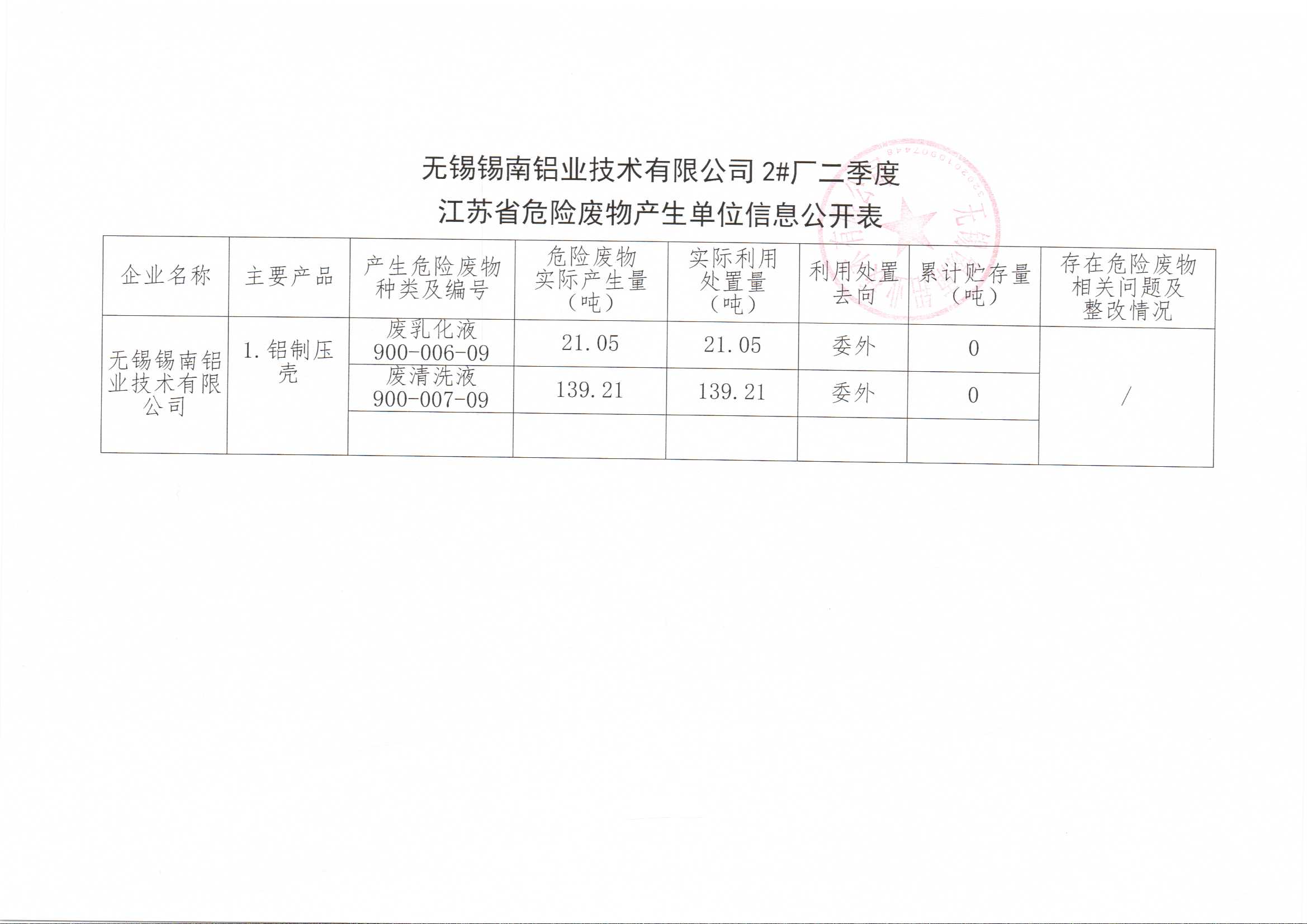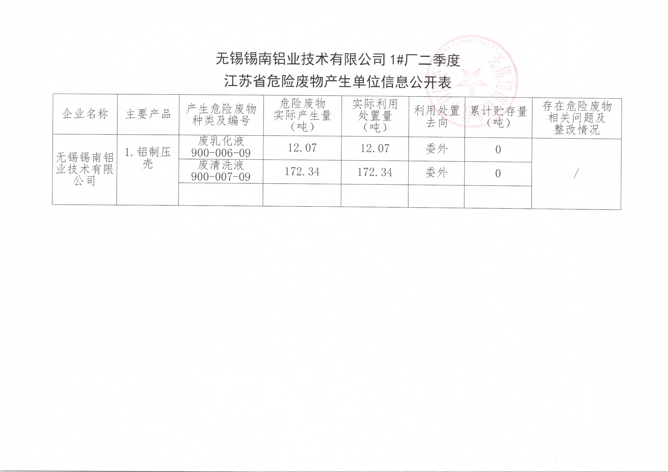 江苏省危险废物产生单位信息公开表(二季度)