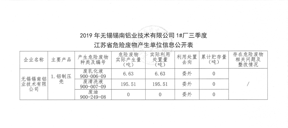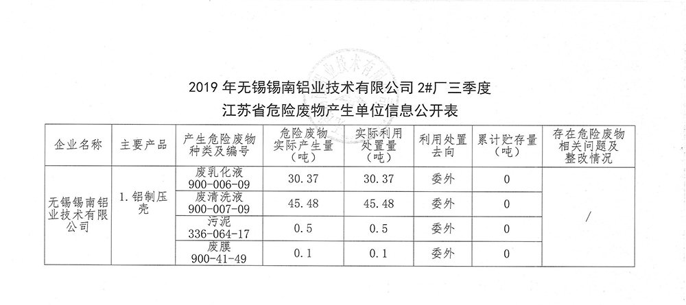 江苏省危险废物产生单位信息公开表(三季度)